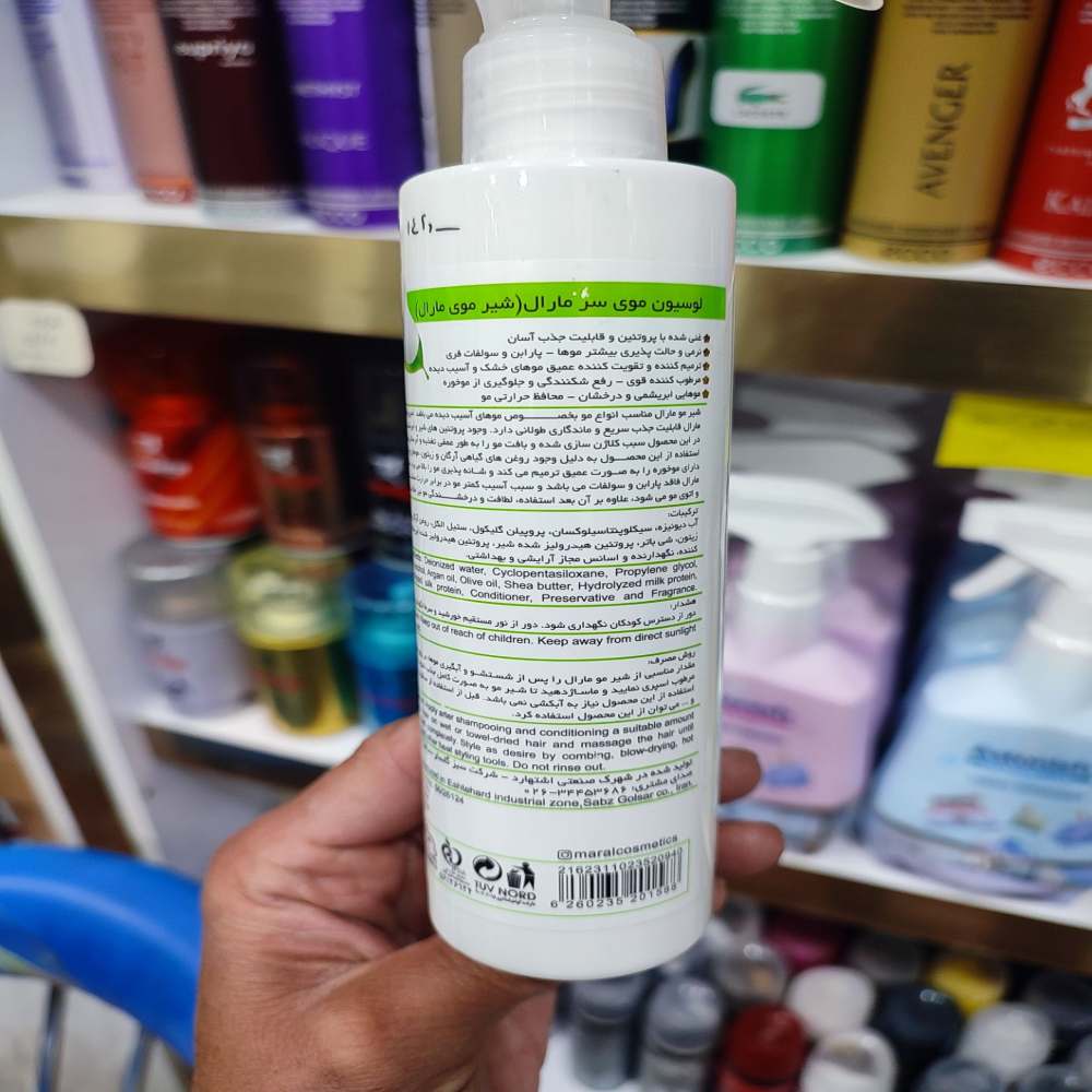 لوسیون مو یا شیر مو مارال با ترکیبی از شیر و عصارههای مغذی، محصولی بینظیر جهت تقویت و ترمیم موهای خشک، آسیبدیده و رنگشده است. این محصول بهراحتی جذب مو میشود و بدون ایجاد حس چربی یا سنگینی، موها را نرم، لطیف و درخشان میکند. وجود ترکیبات پروتئینی و مواد ضد وز، باعث کاهش موخوره، جلوگیری از خشکی و شکنندگی تار مو میشود و حالتپذیری و شانهپذیری مو را به طرز چشمگیری افزایش میدهد.